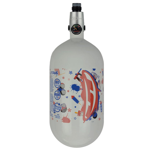 This is the JT 80ci Ultra Air Carbon Fiber tank with the FLO PRO regulator in the limited edition 4th of July White color. The JT Ultra Air Tanks are the lightest carbon fiber tanks approved for use in the USA. Weighing in at 1.99lbs (without regulator), you won't even realize this tank is there. These air tanks are very light weight! Here we have paired it with the new FLO Pro regulator to make a complete air system. The Empire FLO Pro regulator is the result of years of development. This regulator is all about giving you the smoothest, most consistent airflow possible. It uses a fancy balanced fixed ratio piston to achieve this, ensuring your marker gets exactly what it needs, every single time. And the best part? The FLO Pro regulator can be adjusted under pressure, so you can position the gauge exactly where you want it for easy monitoring (Flo tool required). No more awkward contortions in the middle of a game!