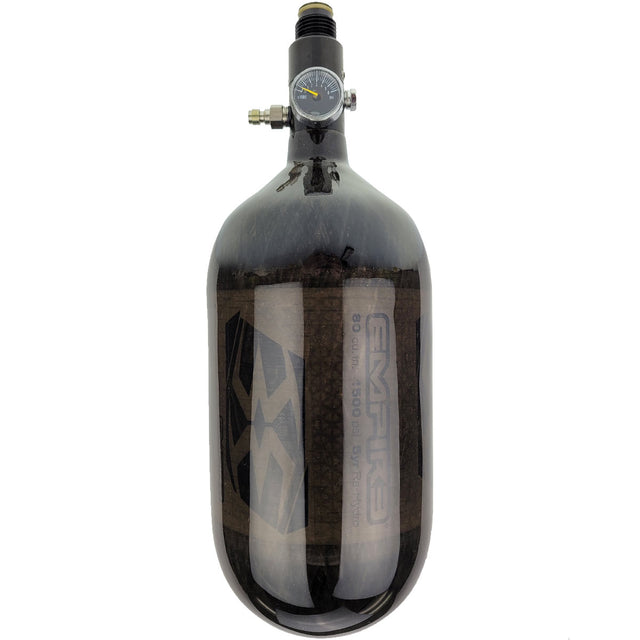 Empire Mega Lite 80ci 4500psi compressed air tanks are made from a strong carbon fiber material and offer an affordable option to the player who wants to upgrade to a High Pressure Air system. These high quality air systems feature a lightweight aluminum regulator that provides steady performance and reliability. With a five-year retest cycle, these Empire Mega Lite tanks will operate for many years of quality performance.