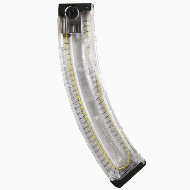 The First Strike T15 V2 30 Round Magazine in the clear color holds more than the previous model. Yes now the T15 magazines are available in this bigger, longer version for those needing more shots. The V2 model is better than the original version for reliable feeding. The First Strike T15 Version 2 30 Round Magazine requires no tools for disassembly and is rated for Full Auto use right out of the box. The magazine design includes a one-piece wrap-around steel top plate assembly and smart surface texturing. Shoot with confidence using the all new First Strike T15 V2 Magazine.