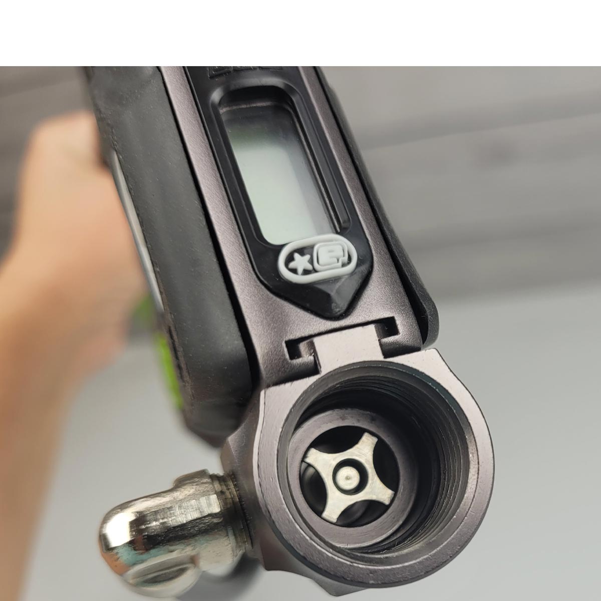 This is a used Eclipse EGO 08 paintball marker in grey with polished green parts.