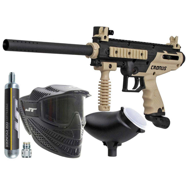 The Tippmann Cronus Power Pack Tan Black is a great starter kit to get. Just add paintballs and hit the field. The Tippmann Cronus combines high performance with incredible durability in a Milsim body. The Cronus features a reliable in-line bolt system in a high-impact composite body with soft over molded rubber grips. This marker is easily modified & features four picatinny rails to mount an assortment of accessories.