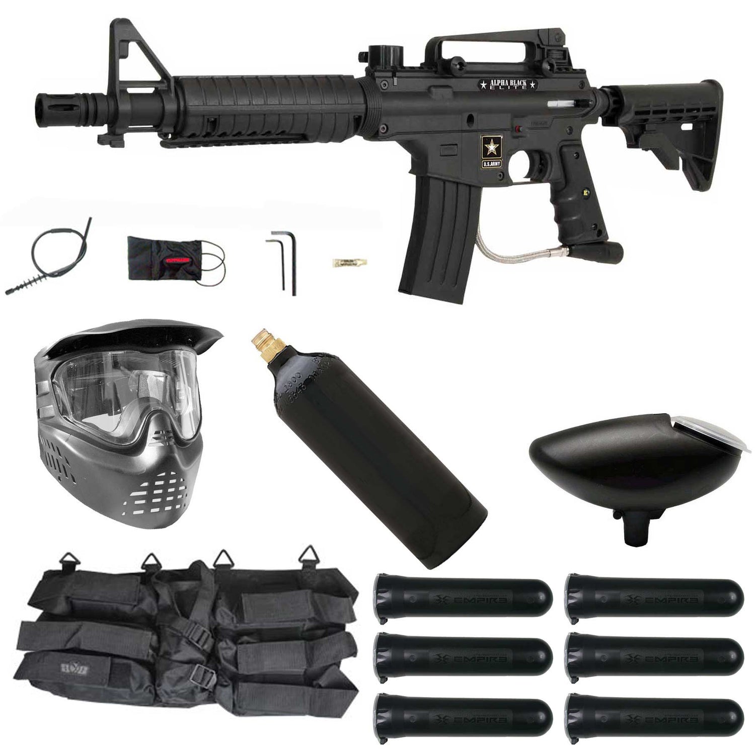 The Tippmann US Army Alpha Black Elite Paintball Gun in Black package comes with everything you need to get started. Save some money with the Tippmann package and it will keep you competitive on the field for years to come.