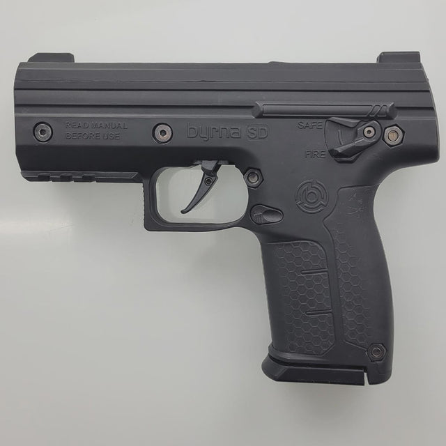This is a used Byrna SD Self Defense Launcher in Black. Included are the Byrna launcher, one magazine and a free lockable pistol case.