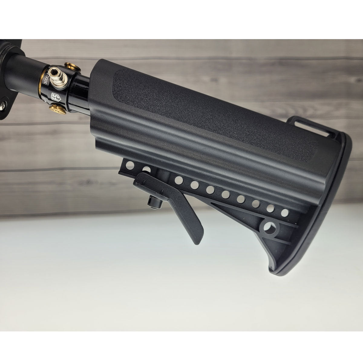 The First Strike T15 is a magazine fed paintball marker offering a true .68 caliber 1 to 1 AR rifle platform. The First Strike T15 features a rugged lightweight aluminum body that will withstand the harshest conditions while maintaining optimum maneuverability. Equipped to use the two included 20 round V2 continuous feed magazines or you can switch to a standard hopper using an adapter sold separately. The First Strike T15 features an integrated 13ci 3000psi tank/stock combo. So there are no external hoses, the tank feeds air right through the stock. The First Strike T15 will accept standard AR grips, handguards, and some other accessories.