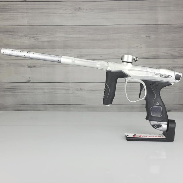 This is a used Dye M3s Paintball Marker with the Whiteout graphic anodizing. A case and wireless charger are included. .688 and .684 barrel backs included.