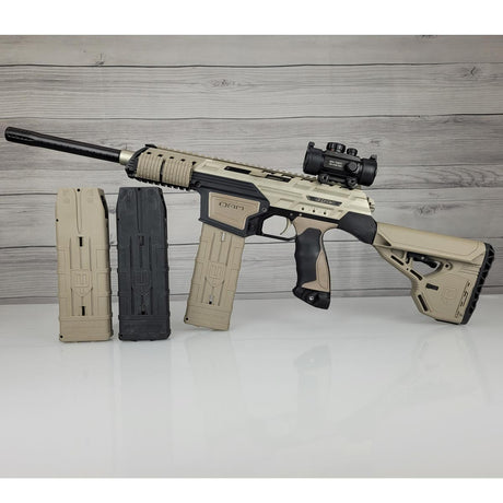 Sale price $999.95 Regular price $1,599.95Unit price /UnavailableDye DAM Paintball Marker Tan w 3 Mags USED 450psi tank needed