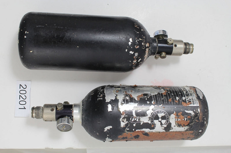 Two 48ci 3000psi Compressed Air Tanks. These will need to be hydrotested before being used. The tanks did hold air when we got them but there may be small leaks. Also, some of the tanks were painted as you can see in the pictures. These will ship empty and yes they need to be cleaned. The gauges might have small cracks from use.