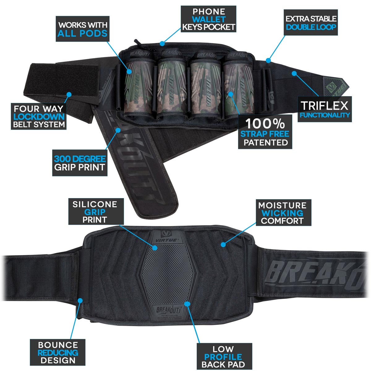 The Virtue Breakout Pack V2 Reality Brush Camo licenses revolutionary strapless technology for your game with its lightning speed one handed load and unload functionality simple enough for anyone to load like a pro. The patented pod holding technology makes you able to load and unload any kind of 135-165 round pod without any adjustments needed. The harness belt is the most stable, has the finest Velcro available which will hold you pods super safe as you slide in to the next bunker. The padded back plate is super comfortable.